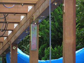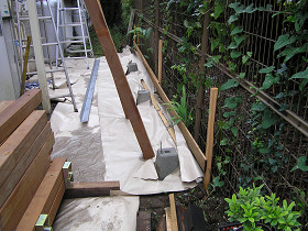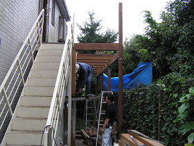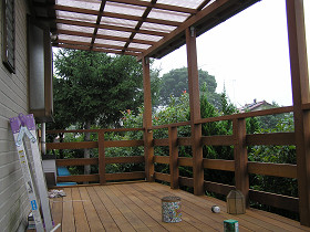 2階玄関部分に夕涼みや洗濯物干しに使えるデッキスペースを製作(立川市) 二世帯住宅の2階玄関部分に、デッキでフリースペースを製作しました 基礎を作って、加工した軸組み材を組み上げます。 敷地が台形だったので、材料の加工が大変でした。 金物で補強しながら組立てします。 デッキを貼って、屋根の下地を作っています。ウリン材は雨ざらしで何十年もの耐久性があるのですが、屋根を掛けて雨ざらしにしないほうが長持ちします。 完成です。夕涼み・洗濯物干しなど色々な目的に使用できます。 材料費 70万円工事費 70万円 合計 140万円~