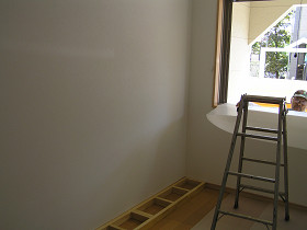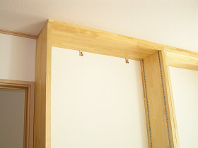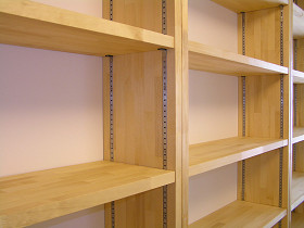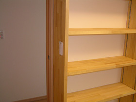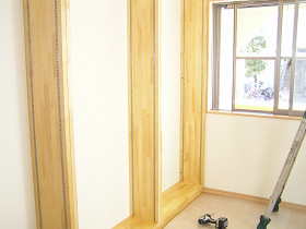 福本工務店手づくり・造り付けの丈夫な本棚を製作(書庫の本の数に合わせて) 市販の本棚でちょうどいいサイズが無く、地震の事も考えて造り付けの本棚を検討されていました。 お客様は仕事上、本を多数所有していたので本格的な本棚が必要でした。 加工場で作っておいた本棚を取付ていきます。間口3mの本棚を1mづつの箱にして製作しました。 下地があるところへ金物で固定します。 棚を設置したところです。棚材は厚み3cmあるので、たわんだりしません。 棚の高さ調整は、1.5cmきざみで調整出来ます。 壁にあったスイッチを移動して完了です。造り付け本棚のメリットは寸法の自由度と丈夫さです。大工が作ると無骨だけど丈夫なものが出来ます。仕上げのクリアーペイントはオスモカラーのウッドワックスで仕上げました。 材料費 15万円工事費 15万円 費用目安 30万円~