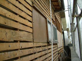 既存のモルタルを撤去すると、下地の『ざら板』が出てきます。『ざら板』には耐震性がないので撤去します。