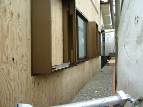 外壁のモルタル下地の『ざら板』を構造合板に変更して壁を補強しました。