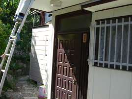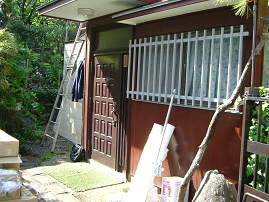 玄関の解体中です。工事初日午前9時から開始して11時位には解体が終了します。作業しているのは、三男の学です。