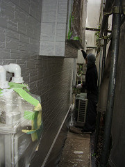 塗装工程です。窓周りや室外機器塗料を付けては駄目な所を養生します。