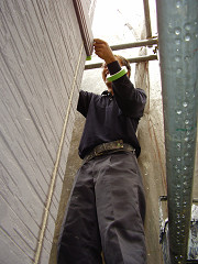 足場を組み外壁の汚れ等を高圧洗浄機で洗い落とします。その後サイディングの目地を撤去して行きます。